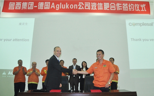 簽約儀式上,來訪客人首先介紹了德國(guó)Aglukon公司概況、葉面肥、懸濁液肥料的特點(diǎn)以及在作物栽培方面的應(yīng)用效果。雙方還就液體水溶肥在國(guó)內(nèi)合作生產(chǎn)、銷售等方面問題交換了意見。隨后,德國(guó)Aglukon公司的市場(chǎng)營(yíng)銷兼研發(fā)部總經(jīng)理Benjamin Klug先生和魯西化肥工業(yè)集團(tuán)副總經(jīng)理李書海在協(xié)議書上簽字。
