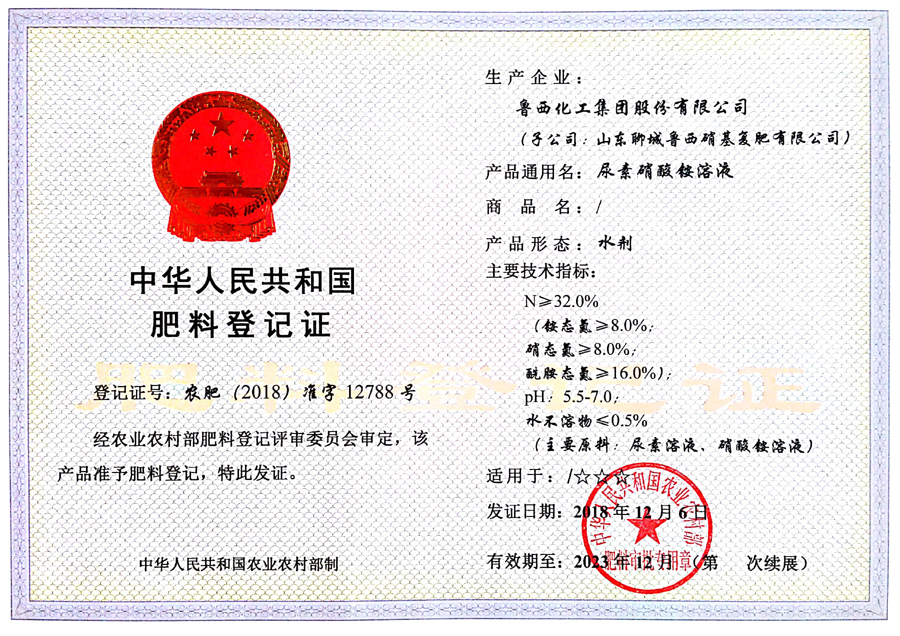 12月21日,收到了農(nóng)業(yè)農(nóng)村部肥料評(píng)審登記管理處寄來的魯西集團(tuán)尿素硝酸銨溶液(32%)肥料登記證,登記證號(hào)為“農(nóng)肥(2018)準(zhǔn)字12788號(hào)”,登記證有效期5年。