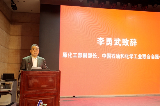 圖為原化工部副部長(zhǎng)、中國(guó)石油和化學(xué)工業(yè)聯(lián)合會(huì)第三屆理事會(huì)會(huì)長(zhǎng)李勇武向大會(huì)致辭。