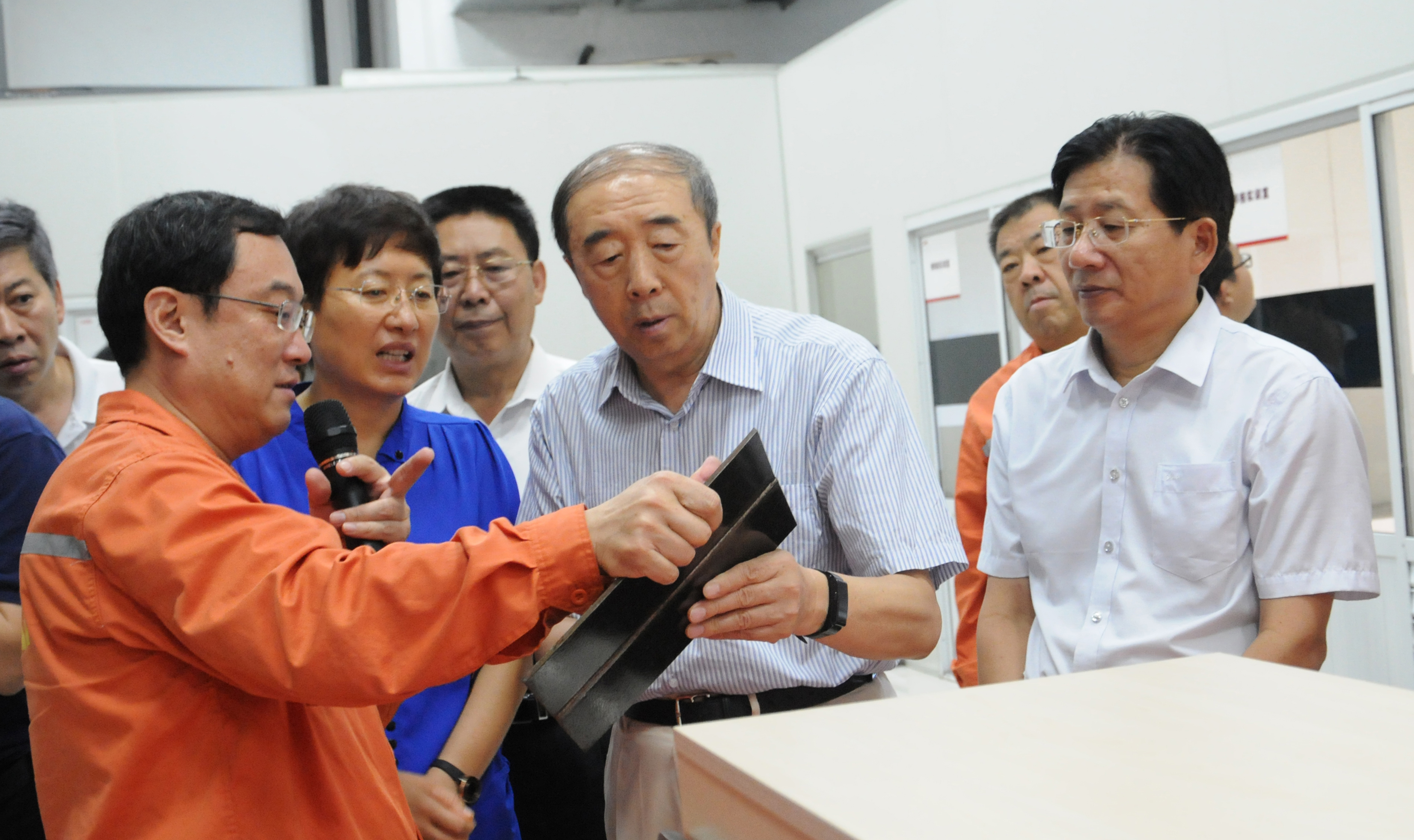 (圖二:王隨蓮副省長在焊接實訓(xùn)區(qū)展示臺,仔細(xì)觀看員工焊接的合金鋼、鈦材等材質(zhì)焊件。)