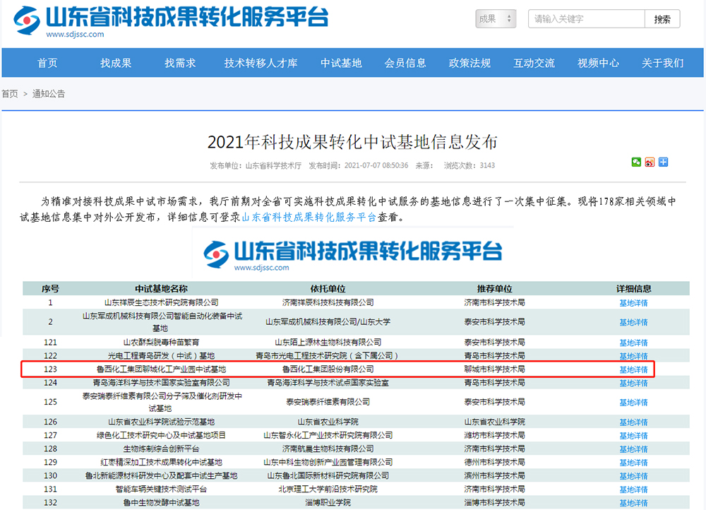 7月7日,山東省科技成果轉(zhuǎn)化服務(wù)平臺(tái)公布了2021年科技成果轉(zhuǎn)化中試基地,魯西化工集團(tuán)聊城化工產(chǎn)業(yè)園中試基地位列其中??萍汲晒性囀旎强萍汲晒D(zhuǎn)化的前提,為進(jìn)一步精準(zhǔn)對(duì)接科技成果中試市場(chǎng)需求,強(qiáng)化科技成果轉(zhuǎn)化全鏈條體系建設(shè),2021年4月,山東省科技廳對(duì)山東省可開展科技成果轉(zhuǎn)化中試服務(wù)的基地信息進(jìn)行征集。