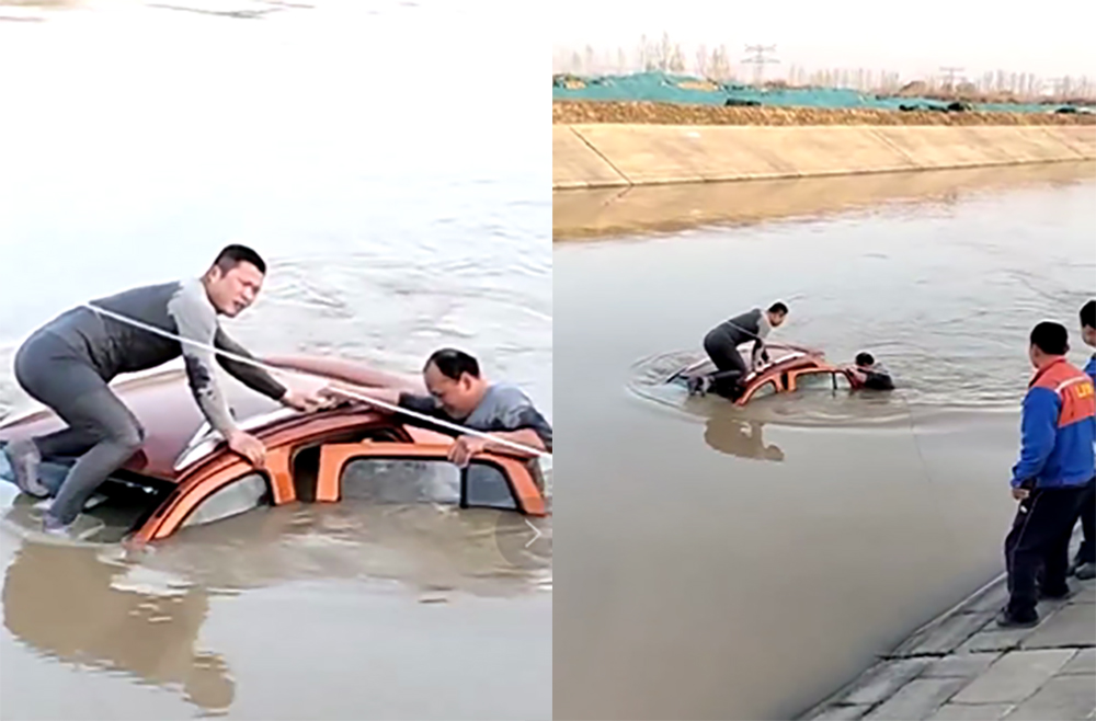 3月28日早6:30,325國道上車流如織,正是魯西集團(tuán)員工上班比較集中的時(shí)間段。此時(shí),在一干渠河水中,有一輛近乎被水沒頂?shù)霓I車自上游緩緩漂下。魯西集團(tuán)第二工程事業(yè)部員工劉繼赟、孫慶旺行駛到325國道一干渠橋時(shí),發(fā)現(xiàn)了這輛在河水中漂浮的轎車。二人隨即停下車,近前查看。但由于河水已近淹沒車頂,無法看到車內(nèi)是否有人員存在。二人立即決定下水營救。