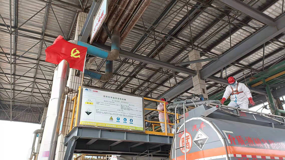 為落地執(zhí)行“外部司機不下車”的防控要求,魯西集團下屬黨組織液體裝卸部黨支部在防疫預(yù)案啟動后駕押人員不下車,工作量增加的情況下,為確保裝卸工和外協(xié)幫扶人員思想穩(wěn)定、操作安全,設(shè)立黨員服務(wù)流動崗。黨支部書記帶領(lǐng)黨員干部深入裝卸現(xiàn)場,發(fā)揮黨員模范帶頭作用,對裝卸量較多的崗位進行黨員輪替定點幫扶,黨旗高高飄揚在裝卸現(xiàn)場崗位,為員工鼓勁加油,共闖疫情難關(guān)。