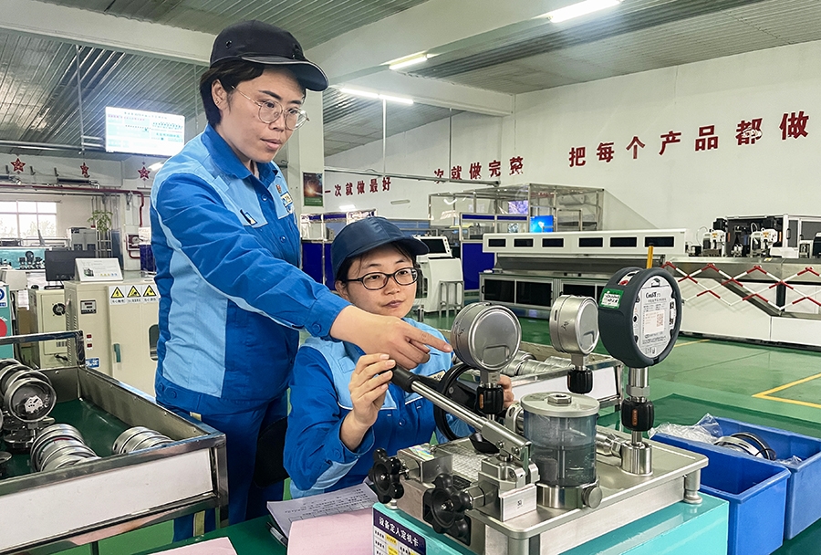 干一行、愛一行、專一行、精一行。從壓力表組裝、變送器校驗(yàn),到膜片焊接、法蘭變送器注油……她不但能夠熟練掌握每一道工序的操作,還善于發(fā)現(xiàn)和解決影響產(chǎn)品制作的各種生產(chǎn)瓶頸。壓力表、變送器的制作工序繁瑣復(fù)雜,工作流程稍微有停滯,就會影響整個(gè)工序的運(yùn)行。隨著產(chǎn)品類型的增多,打壓工序原有的打壓工裝已不能完全滿足各種法蘭的打壓需求,尤其是特殊工藝要求的法蘭工裝。為解決這一難題,張鳳娟白天向機(jī)加工師傅學(xué)習(xí)取經(jīng),晚上自學(xué)CAD制圖,從一個(gè)簡單的法蘭孔畫起,直到一套完整的打壓工裝設(shè)計(jì)制作完成,在她不懈的努力下,打壓工作效率由每天10臺提高到30臺。
