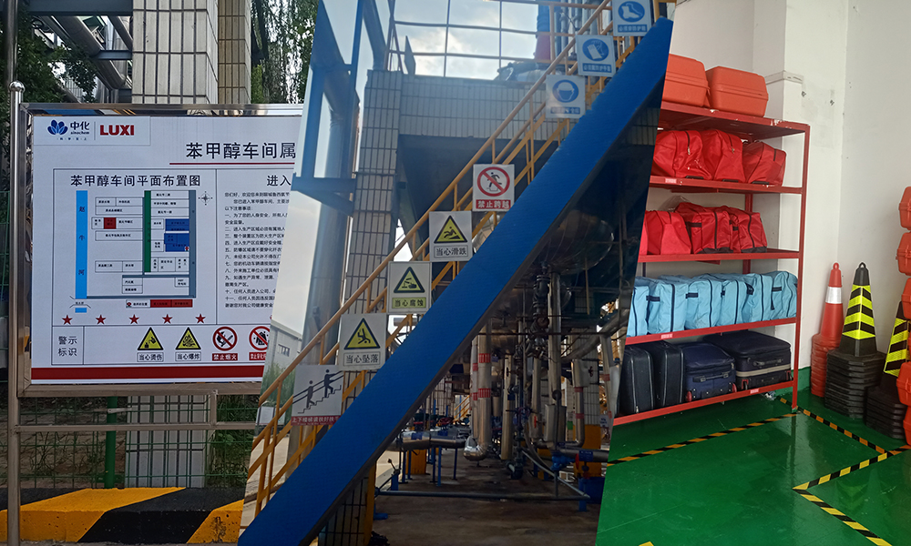 走進氯化芐事業(yè)部生產(chǎn)區(qū),各類管理信息映入眼底。裝置主入口處設(shè)置了包含企業(yè)簡介、廠區(qū)平面布置圖、進入生產(chǎn)區(qū)域勞動防護用品要求等信息的宣傳欄,在主干道兩側(cè)醒目位置設(shè)置了企業(yè)HSE管理信息公告欄,信息公示屏正在公開循環(huán)展示企業(yè)安全里程碑及環(huán)保信息。在氯化鈣車間檢修現(xiàn)場,各類工器具均粘貼了合格標(biāo)識,具有檢驗人、檢驗日期及檢驗結(jié)果等相關(guān)信息。現(xiàn)場氣瓶及托架已經(jīng)按照標(biāo)準(zhǔn)要求涂色,氣瓶粘貼著安全警示標(biāo)簽,瓶身也采用標(biāo)牌標(biāo)明了氣瓶狀態(tài)。來到應(yīng)急站,室內(nèi)使用貼地膠帶、油漆、名稱標(biāo)識等方式對應(yīng)急物資進行了定置擺放,視線之內(nèi)物品放置整齊有序、取用方便、符合規(guī)范。
