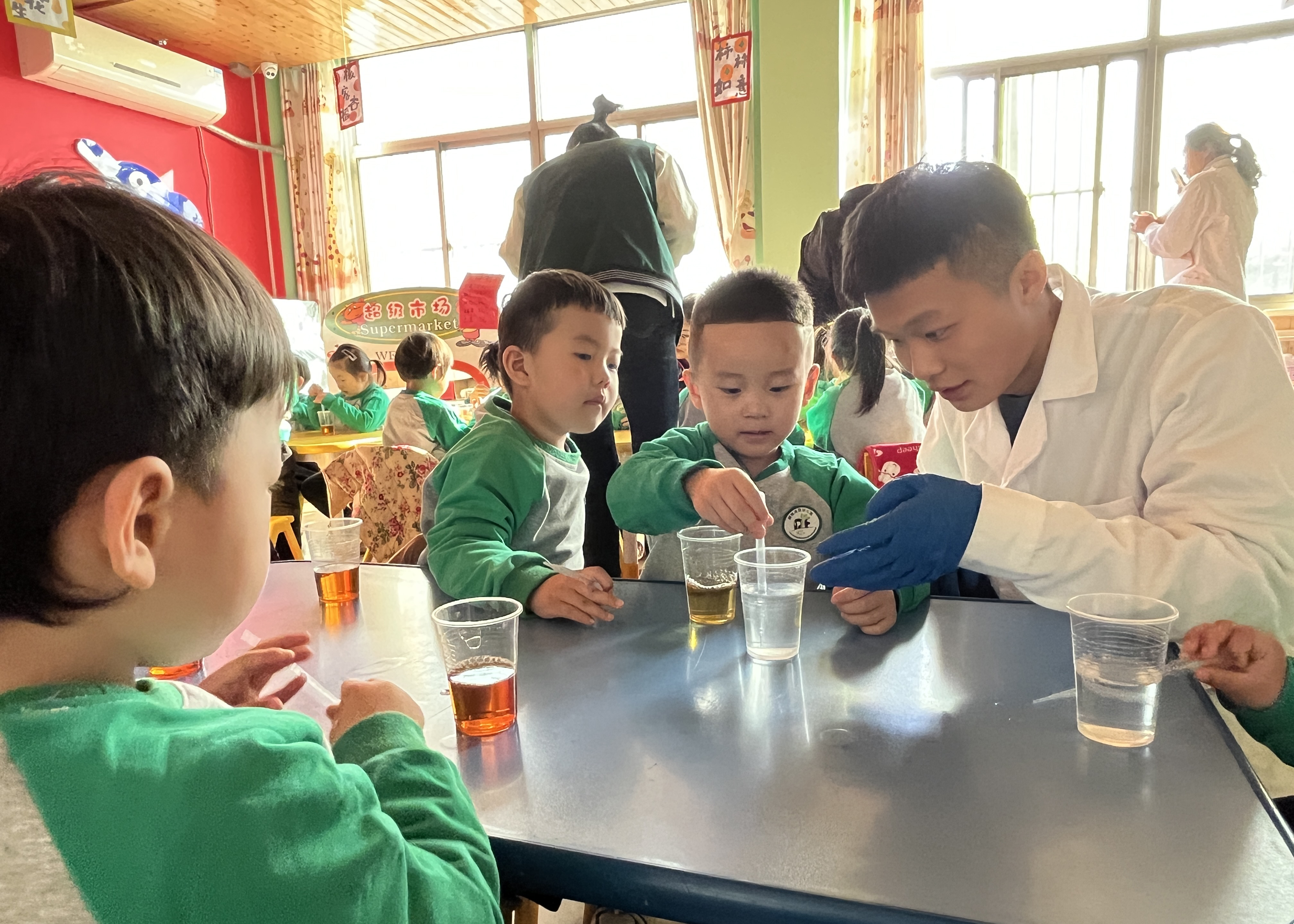 海源幼兒園中二班的教室里不時(shí)傳來(lái)小朋友的的歡呼聲,“顏色變了、顏色變了.....”小朋友們瞪大了眼睛觀看燒瓶中液體顏色的變化,隨著溶液顏色的變化爆發(fā)出來(lái)熱烈的掌聲。在這愉快的氛圍中,魯西化工工程學(xué)院的志愿者和孩子們共同完成了一次魔法實(shí)驗(yàn)課。臨別之際,海源幼兒園園長(zhǎng)王艷高興地說(shuō)道:“看到孩子們天真無(wú)邪的笑臉和充滿(mǎn)好奇的眼睛,感謝你們給孩子們的人生帶來(lái)了生動(dòng)的科普實(shí)驗(yàn)課?!?